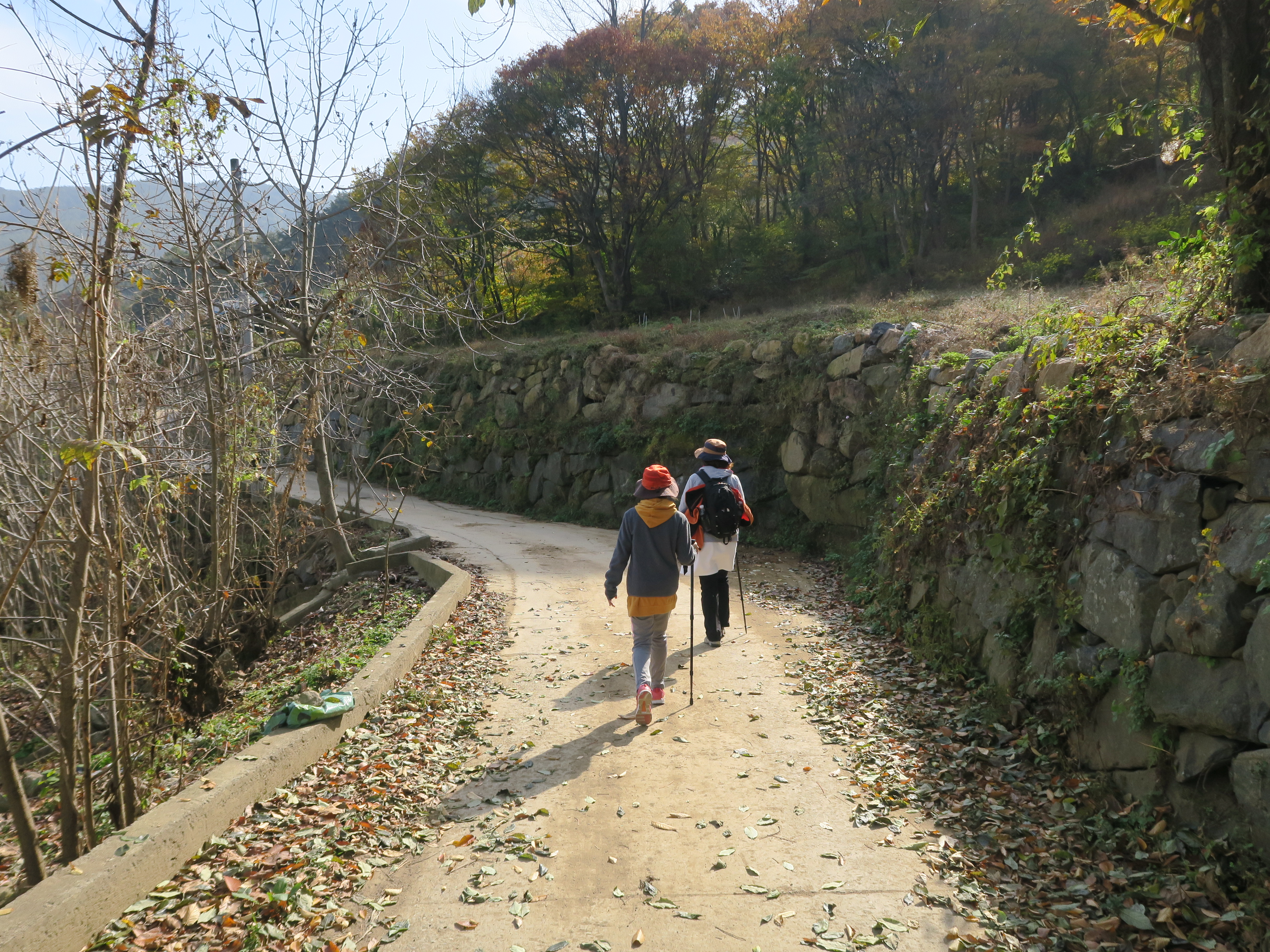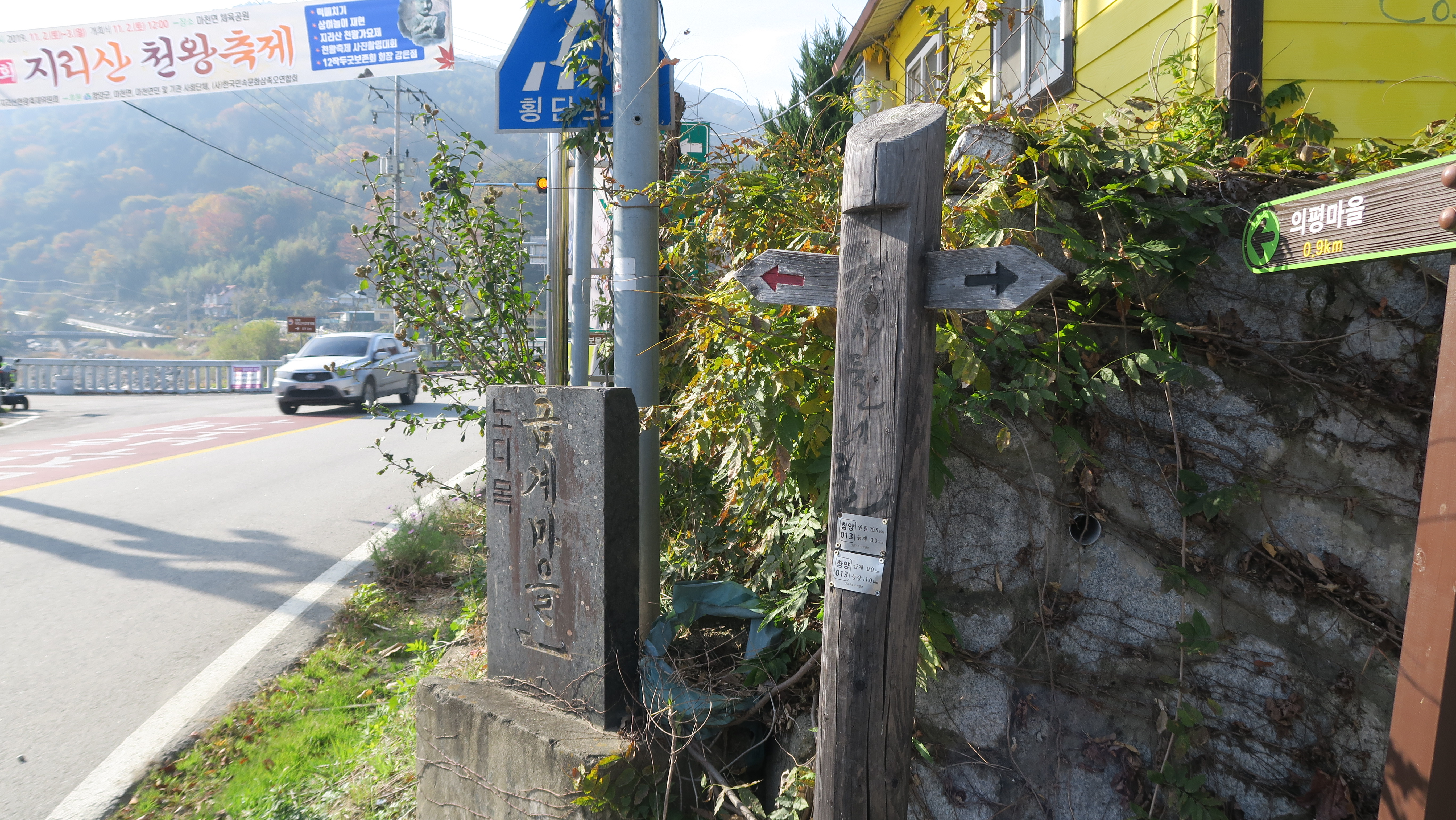 동강마을에서 금계마을까지는 버스로 30분 정도. 3구간 종착지였던 금계마을에서 이날의 지리산둘레길 4구간을 시작한다. 이번 둘레길은 엄천강을 따라 6개의 마을을 이어주는 길이다. 산길도 있지만 용유담을 지나서는 시멘트나 아스팔트길도 걸었다. 의중마을을 지나 이어진 산길과 송전마을을 빠져나오면서 맞이한 낙엽떨어지는 길, 운서마을과 구시락재로 이어진 산길 등이 호젓하게 걷기 좋았다.
