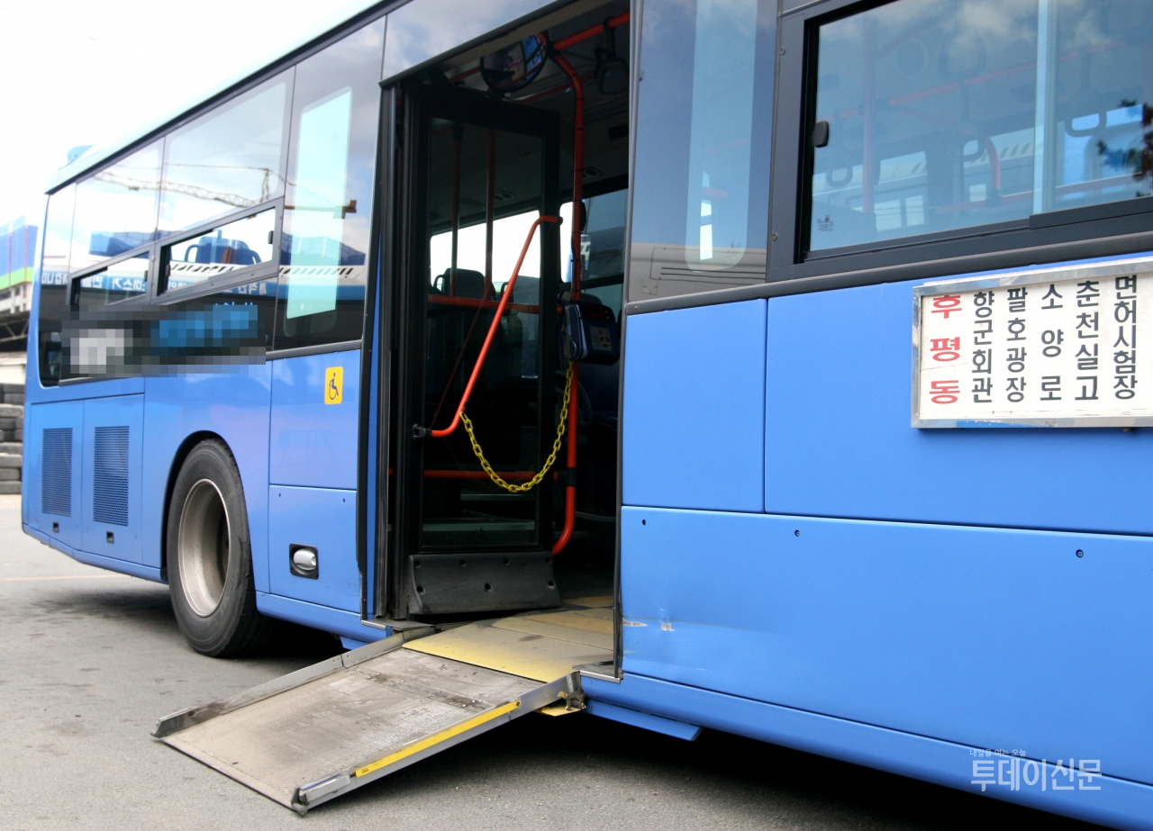 뒷문에 서 있던 사람들이 길을 열어 주었다. 잠시 기다려 보지만 버스 휠체어 승하차용 발판이 내려오지 않자, 다시 그 분은 다시 바깥에 있는 어떤 사람에게 도움을 요청했다.