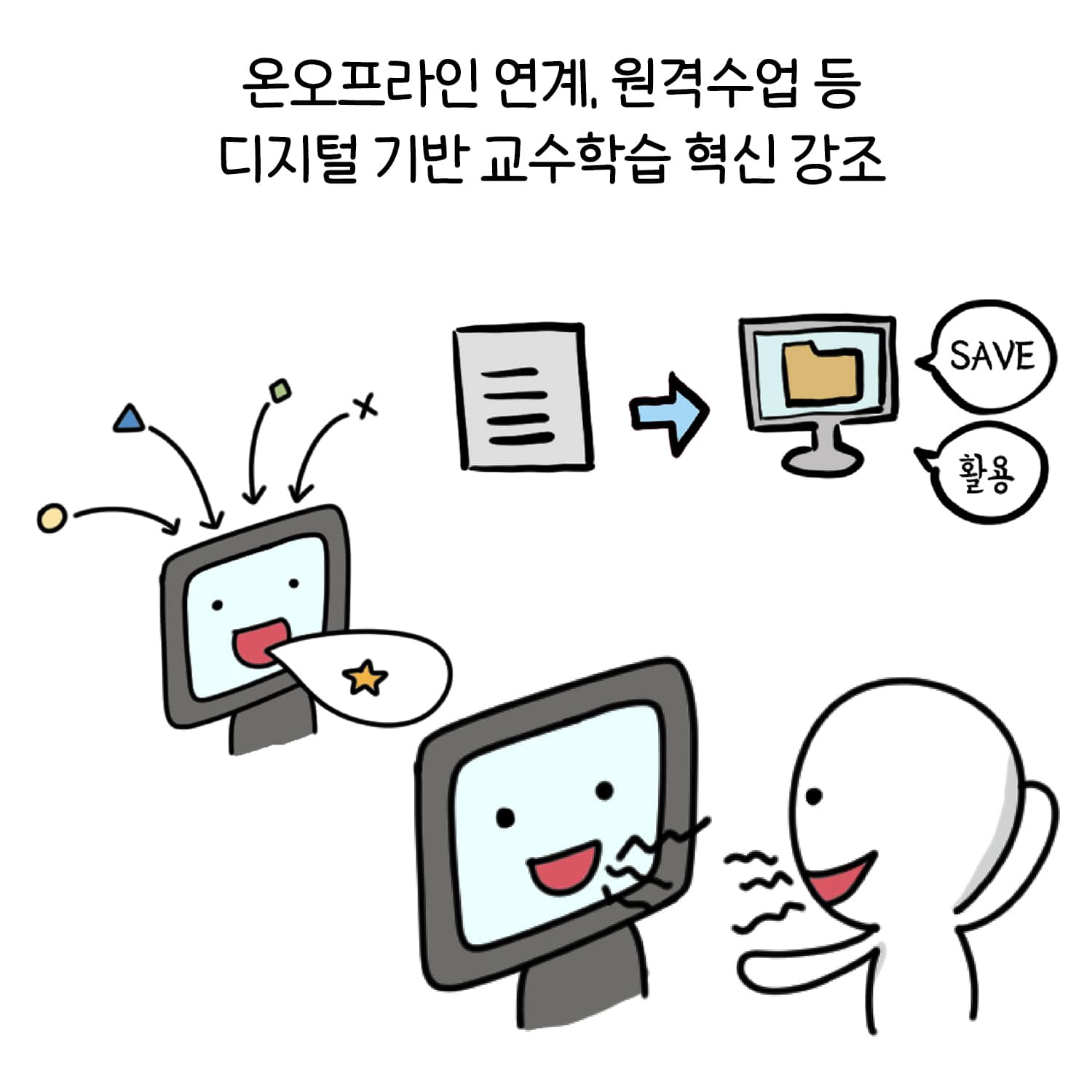 개정의 중점 사항의 하나다. 디지털·AI 교육 환경에 맞는 교수 학습 및 평가 체제를 구축해 달라는 요구가 많았다. 특히 코로나19 감염병 상황에서 학교 교육은 큰 변화를 맞았다. 이 과정에서 디지털 혁신의 필요성이 더욱 강조되었으며 이와 함께 디지털 격차로 인한 학습 격차가 심화되는 현상도 나타났다. 비대면 원격 교육의 확대도 필요하지만 이로 인해 나타날 수 있는 학습 결손에 대한 대안도 나와야 할 것으로 보인다.