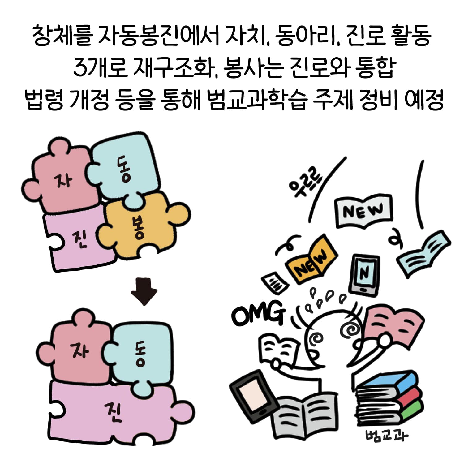 창의적 체험활동이란 교육과정 상에서 교과 외의 활동을 말한다. 2015에서는 창의적 체험활동으로 자율활동, 동아리 활동, 진로 활동, 봉사 활동이 있었는데, 2022에서는 봉사 활동이 빠진다. 완전히 빠지는 것은 아니며, 봉사활동의 내용은 동아리 및 진로 활동으로 통합된다.