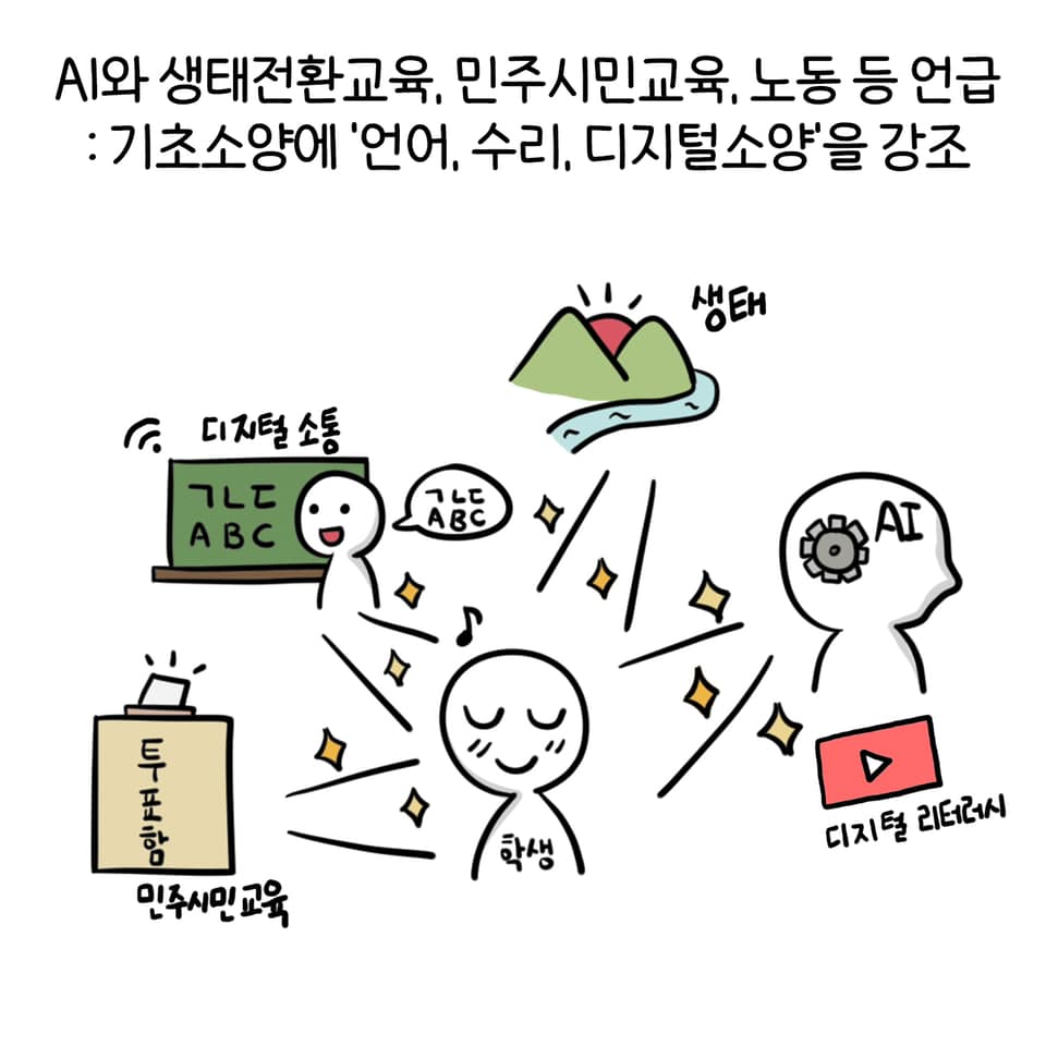 이와 함께 디지털·AI 소양 함양 교육이 강화된다. 디지털 기초소양 함양을 위해 '디지털 리터러시(Digital Literacy)'와 '컴퓨팅 사고력(Computational Thinking)'으로 구성되는 교육과정을 마련할 예정이다. 이를 위해 초등학교에서는 정보 관련 내용으로 학교장 개설 과목으로 추가 편성할 수 있으며 실과 교과를 포함하여 학교 자율시간을 활용하여 34시간 이상 시수 확보를 권장하고 있다. 고등학교의 경우 기술가정 교과군이 기술가정/정보 교과군으로 편성되어 인공지능 및 빅데이터 등 다양한 신기술 분야 과목을 신설하여 가르치게 될 것이다.